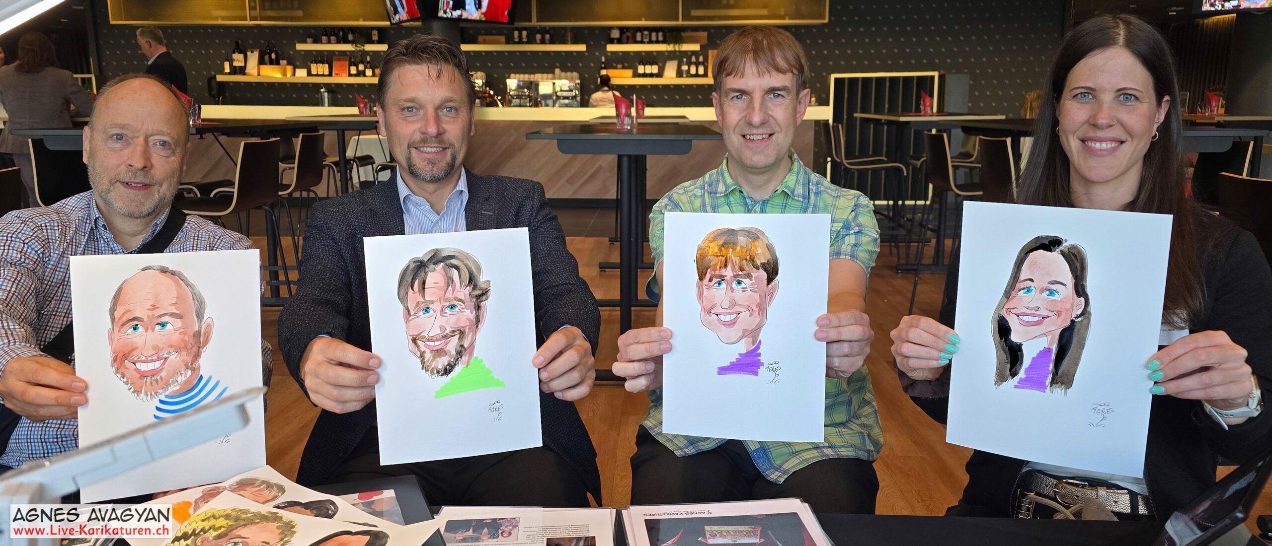 Ich liebe meine Anlässe und das Treffen so vieler neuer Menschen. Besonders spannend ist es, mehrere Personen gleichzeitig zu zeichnen. Live-Karikaturen sind für mich Austausch, Freude und Begegnung in einem.