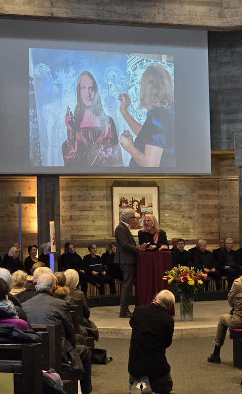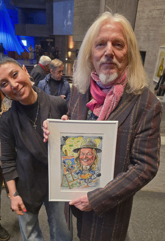 Vor ein paar Jahren hat mich das Fasnachts-Heft der Fröschenzunft von Meggen angefragt, Wolfgang als Karikatur in meinem Comic-Stil farbig zu zeichnen. Das Originalbild wollte ich ihm schon damals schenken. Mit seiner Vernissage bot sich nun eine gute Möglichkeit, dies zu tun und ihn dabei persönlich kennenzulernen. Es war die ideale Gelegenheit, seine Vernissage zu sehen und das Interview, das er mit Herbert Gut, dem Pfarreileiter der Kirche, geführt hatte, zu hören und zu geniessen. Es war sehr spannend!